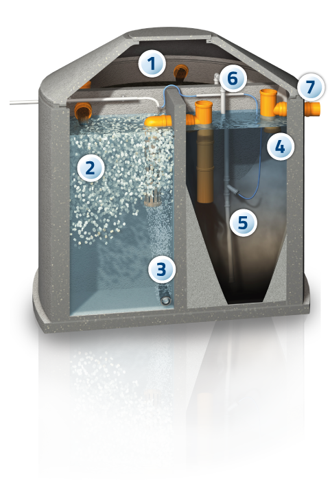 Die patentierte Wirbelbett-Technologie sorgt dabei für eine gleichmäßige Sauerstoffverteilung und stabile biologische Reinigung – auch bei Unterlast oder schwankender Nutzung.